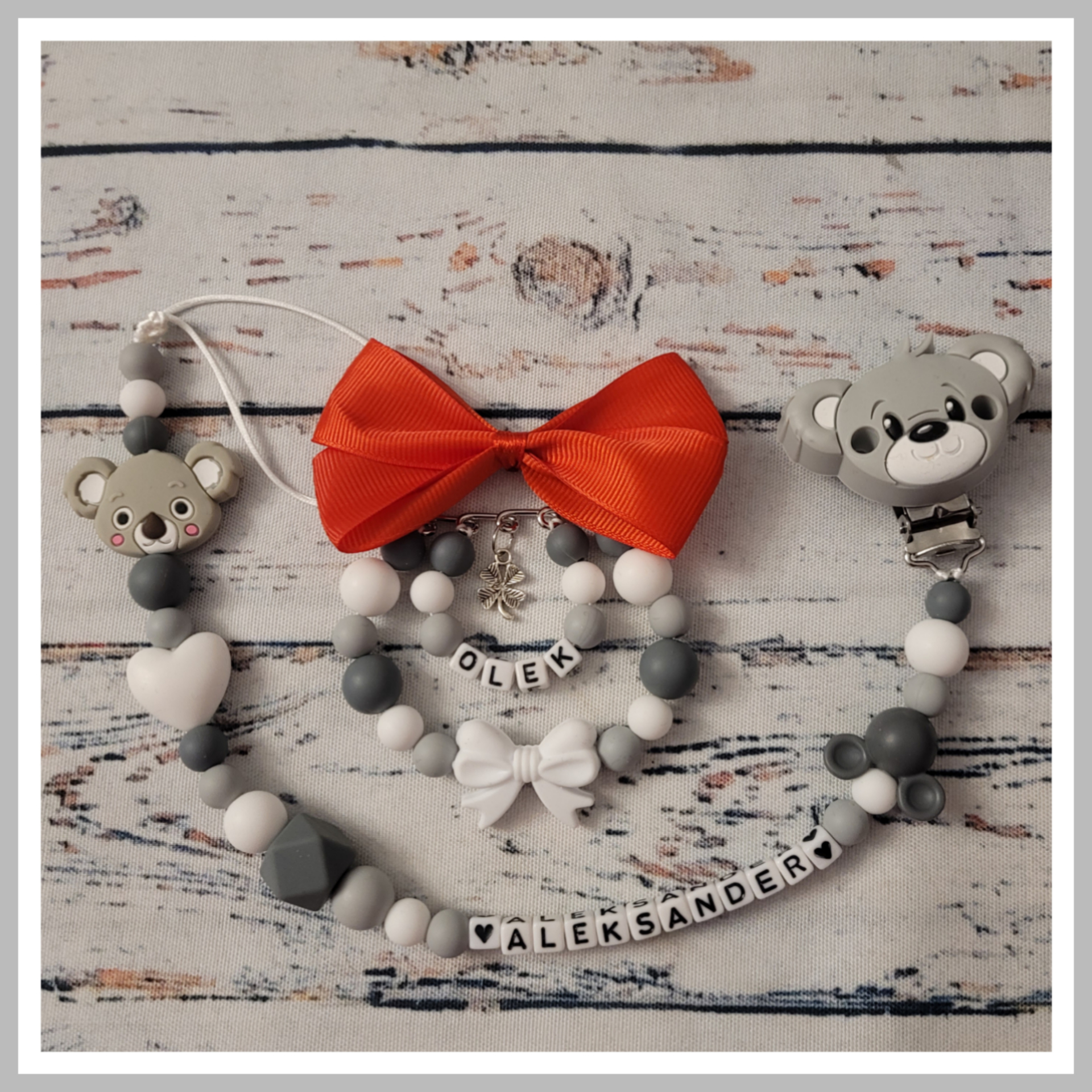 Z obu stron zawieszka jest tak zabezpieczona, aby koraliki nie miały możliwości na zsunięcie się, co sprawia, że zawieszka jest bezpieczna dla dziecka. Zawieszki  wykonane są z najwyższej jakości materiałów, które posiadają wszystkie niezbędne atesty, wykonane są z bardzo wytrzymałych tworzyw, nie zawierają toksycznych substancji typu BPA, PVC, latex itp...